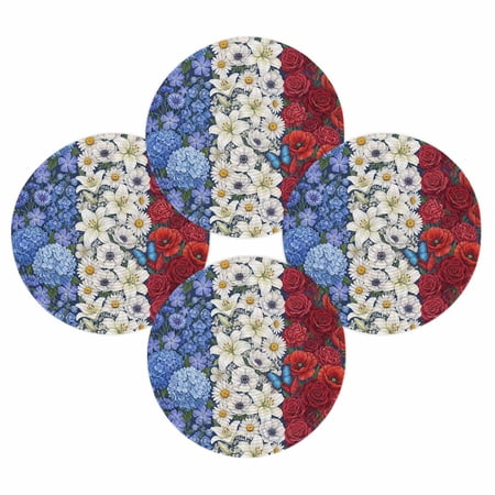 4th of July Round Woven Placemats for Indoor Outdoor Dining Table Independence Day Decor Give an elegant decor touch to your home and add an natural art aesthetic atmosphere. [Product Description] Package: Placemats Set of 2/4/6/8 PCS Size: Diameter 15 Inch Material: Premium Polypropylene Matches delicately and creates a unique lifestyle for your dining table kitchen garden party banquet hotel diner receptions cafe bar picnic BBQ patio any outdoor and indoor use. [Multiple Design Occasion] Adopting advanced digital printing technology bright colors and clear images sturdy weave overall elegant and beautiful. Our place mats come in a variety of vibrant colors patterns full of natural aesthetic feeling for you to decorate your home. Our placemats set are reusable reusable and exquisite. Great choice as a considerate and delicate gift for family members couples friends and roommates. The high end placemats look elegant and stylish could be used for cups plates some tableware cooking pots potted plants etc to meet your different needs. [Warm Tips] Wipe clean with damp sponge or cloth. Both machine and hand washable with gentle cycle and lay flat to dry no bleach iron on low heat if required. The colors may have slight differences due to different screens. Due to the official package restrictions placemats rolled up in the box we suggest put some heavy things on the mats after unboxing the crease will disappear and it will be flat. [Special Note] How to make the placemats flat? Unboxing → Crease the back → Turn over the placemats opposite → Make the front side up → Put heavy things on it → After a while they will be flat