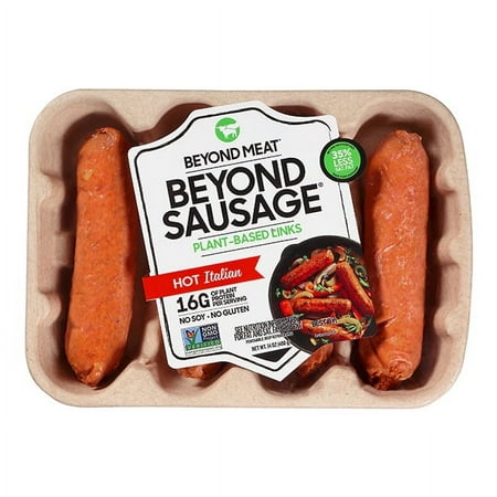 Beyond Meat Beyond Sausage Plant-Based Dinner Sausage Links Hot Italian 14 oz From grill to frying pan Beyond Sausage is stuffed with delicious flavor and satisfying sizzle. It s also an excellent source of protein (16g per serving) has no cholesterol and is lower in saturated fat (35% less than a leading brand of pork sausage). Made from simple plant-based ingredients – like peas brown rice and faba beans – our Beyond Sausage has no GMOs soy or gluten. Each pack contains 4 plant-based links that can be thrown in a bun put on kebabs sliced onto pizza or crumbled into sauce. Enjoy every bite. See nutrition panel for fat sat fat and sodium content.