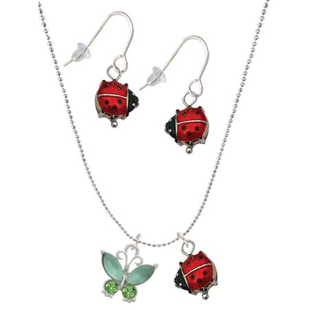 Imitation Rhodium Plated Butterfly with Frosted Green Resin Wings & Lime Green Crystals Red Lucky Ladybug Necklace and Dangle Earrings Set. Charm size is approx. 0.62 x 0.6 x 0.16 inches (HxWxD) including loop. This adorable hand painted enamel ladybug is approximately 0.5 inches wide and 0.4 inches long. Ladybugs are good luck symbols and said to give blessings. This female jewelry set comes with an 18 inch faceted ball chain necklace that has a spring ring clasp. The necklace chain is light weight and sparkly. French earrings are stainless steel hooks. PLEASE NOTE: Our products are lead safe but are not intended for children 14 years and younger.