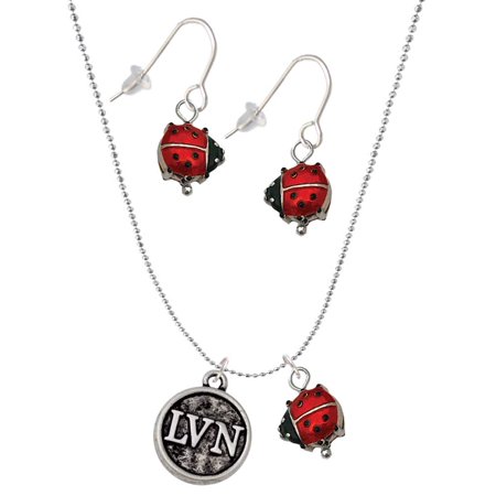 Silvertone Antiqued Nurse Caduceus Seal – LVN Red Lucky Ladybug Necklace and Dangle Earrings Set. Silvertone Nurse Caduceus Seal – LVN is approx. 0.78 x 0.66 x 0.15 (HxWxD) including loop. Antiqued Seal Design with LVN on the front and a Caduceus on the back. This adorable hand painted enamel ladybug is approximately 0.5 inches wide and 0.4 inches long. Ladybugs are good luck symbols and said to give blessings. This female jewelry set comes with an 18 inch faceted ball chain necklace that has a spring ring clasp. The necklace chain is light weight and sparkly. French earrings are stainless steel hooks. PLEASE NOTE: Our products are lead safe but are not intended for children 14 years and younger.
