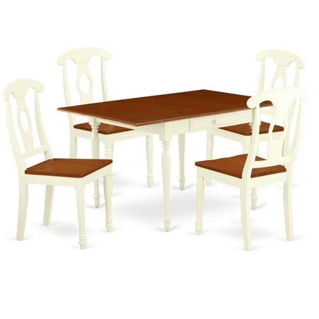 MZKE5-WHI-W East West Furniture MZKE5-WHI-W 5 Pieces Dining Room set – Durable Drop Leaf Hardwood Dining Table and 4 Real Wood Seat Dining Chairs Buttermilk and Cherry Finish East West Furniture 5 Pieces Dinette SetFabulous kitchen dinette set for your amazing dining room. This dining table set for 4 is ready to improve the beauty of your dining area with its flawless style. We provide four elegant wood chairs and a durable dining table in this 5-piece kitchen table set for 4. Our dining chairs offer a comfortable wooden Napoleon back which keeps the user comfortable all the time. Hardwood seat of these dining room chairs is smooth and comfortable enough to offer you a fantastic sitting experience. Buttermilk Finish Body and Cherry seat offer an impressive glance to your kitchen dining table set. This dining kitchen table set is very robust and reliable because it is constructed from premium quality Asian hardwood also known as Rubberwood. The structure of the Dining Table and kitchen chairs is manufactured by the hands of perfect knowledgeable carpenters to deliver a magnificent finish. This kitchen table set for 4 is quite simple to assemble to save your energy and move it to other places. You can simply assemble these dining room chairs and rectangular table yourself at your home in a couple of minutes with a few simple tools as well as these modern dining chairs and rectangle dining table are easy to clean up. Good hygiene is an important variable when it comes to a home. You can simply clean up it as you clean the other furniture. Almost all good furniture cleaners and shiners perform perfectly on this wood dining table set. KEY FEATURES: Material: Hard Wood Color: Buttermilk and Cherry Wood Kitchen Table Dimensions: Length 36/54; Width 36; Height 30 Modern Dining Chairs Dimensions: Length 21; Width 18; Height 38 Table s Extra Features: Two 9-inch Drop Down Leaves and 2 Drawers Package Includes: 1 Dining Room Table 4 Dining Room Chairs
