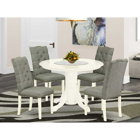 Dining Room Set Linen White SHEL5-WHI-07 EAST WEST FURNITURE 5-PIECE KITCHEN TABLE SETS 4 AMAZING PARSONS DINING ROOM CHAIRS AND RECTANGULAR MODERN DINING TABLE This modern dining table set includes 4 remarkable parson chairs and an awesome 4 legs dining table. The modern dining set delivers a Linen White hardwood dining room table and frame and a fantastic Smoke parson chairs seat and Button tufted that bring magnificence to your dining-room and improve the charm of your great dining area. The high quality of our beautiful chairs helps our beautiful customers to get relaxation and feel free when getting their meal. This kitchen table built from premium quality rubber wood which can bear the weight of 300 Lbs. Our parson chairs have a wooden frame with a luxury seat of superior quality foam which is covered with Linen Fabric that gives you relaxation with family or friends. This listing has a premium color of Linen White finish for Pedestal table and Smoke parson dining chairs. Our wonderful premium colors improve the beauty of your living area and give a luxurious appearance to your living area or dining area. East West furniture always built from modern furniture along with easy assembling parts. We try to keep our furniture parts modern as well as simple. Our high-class Pedestal dining table set is best for your wonderful dining room as well as the kitchen. You can use it for casual home parties. Keep enjoying East West modern furniture! Features: kitchen dining table Dimension: Length 42; Width 42; Height 30. Wood Color: Linen White Fabric: Linen Fabric parson chairs Dimension: Length 24.5; Width 19; Height 40.5. Fabric Color: Smoke Package Include: 4 Lovely parson chairs and A Gorgeous Pedestal dining table. Our dining room table set includes 4 of the stylish parson chairs. parson dining chairs has a style fit for royalty. Our parson dining chairs is upholstered in your option of color perfectly accented with button tufting high back. This standard Padde Our parson chairs seat and back are padded and button tufted high back. The durable wooden legs are finished in Linen White color to match the style. These high-back parson chairs are slightly and elegantly curved expertly finished with velvety soft Our kitchen set is constructed of wooden and fabric. This wood delivers great stability and fabric provides comfy sitting. These parson chairs and dining room table are manufactured from the hands of experienced carpenter that’s why this small dining Our dining room set is cozy and relaxing because the back and seat of our 4 parson chairs are fabricated of good quality Linen Fabric which provides complete comfort and fantastic sitting experience. Our kitchen table is including 4 legs and a round Dimensions of Beautiful wood table: Length 42; Width 42; Height 30. and the dimensions of fabulous parson chairs are: Length 24.5; Width 19; Height 40.5. These stylish 4 parson chairs and a small table are simple to build. The classic design of these unique parson chairs fits nicely with any decor and a soft cushion padded in smooth Linen Fabric will keep users comfortable. It s parson chairs solid wood structure and Linen Fabric seat are quite simple to clean. You can clean dust simply and frequently to save time by using a duster or vacuum cleaner. An ageless easy elegant design can match properly with any decor theme – Item1 Dims: L 42 x W 42 x H 30 – Item1 Type: Dining Table – Item2 Type: Table Pedestal – Item3 Dims: L 19 x W 25 x H 41 – Item3 Type: Parson Chairs
