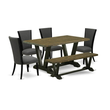 East West Furniture V676VE650-6 6 Piece Mid Century Dining Set – 4 Dark Gotham Grey Linen Fabric Kitchen Chairs with Nailheads and Distressed Jacobean Dinner Table – 1 Wood Bench – Black Finish EAST WEST FURNITURE – V676VE650-6 – 6-PC KITCHEN TABLE SET This unique 6-piece modern dining table set contains 1 rectangular table a modern bench and 4 chairs for the dining room will create a wonderful sitting experience and also the high back provides full support to your back. This wooden dining table has a rectangular Distressed Jacobean table top and Wire Brushed Black V-Style Legs. These nailhead dining room chairs have Dark Gotham Grey linen fabric and Black solid wood modern chair legs. The modern dining table set will give a touch of attraction into any home with a timeless and modern appearance that easily blends into any kitchen room decoration. Exquisite hardware and a detailed manual of the wooden table are included in the package. All assembly parts of the dining table set are described in number and specific assembly steps will be shown in the instruction manual of the dining table set. Our dining table set is simple to clean with damp fabric and furniture cleaner because of the smooth brush finish. Enjoy with East West Furniture! MODERN DINING TABEL SET FEATURES: Fabric Type: Linen Fabric Fabric Color: Dark Gotham Grey Dining Chairs Legs Color: Black Dining Room Chairs Back Style: High Back Modern Kitchen Table and Wood Bench Top Color: Distressed Jacobean modern dining table and Kitchen Bench Legs Color: Wire Brushed Black Modern Dining Chairs Dimension: Length: 24.7; Width: 20.25; Height 39. Dimension of Wooden Dining Table: Length: 60; Width: 36; Height 30. Dimension of Wood Bench: Length: 60; Width: 15; Height 18. Dining Room Set Include – 4 Dining Room Chairs 1 Wood Bench and 1 Wooden Table. The 6-Piece Mid century dining set comes with an elegant wood table with 4 modern chairs and a modern bench. This wooden dining table and kitchen chairs are a good choice the simple design is very comfortable. This modern dining table set offers a g These kitchen chairs legs are finished with Black and the seat color is Dark Gotham Grey. The table top finish is Distressed Jacobean and the leg color is Wire Brushed Black. Our mid century modern chair comes with a touch of class and their stylish Our kitchen table set is crafted from superior quality Asian wood know as Rubber Wood to ensure good sturdiness and durability. The dining table set is crafted with the help of highly experienced carpenters to provide a luxurious appeal to any dining The modern design kitchen chairs have soft upholstered fabric with a solid wood frame perfectly accented with a High Back. The kitchen chairs have upholstered seats complete the appeal of the dining room moreover wide seats are good to offer more c The Dimensions of Dining Chair are: Length: 24.7; Width: 20.25; Height 39. Dimensions of the Dinner Table are: Length: 60; Width: 36; Height 30. Dimensions of the Small Bench are: Length: 60; Width: 15; Height 18. Our Dinette Set is long lasting and Water Resistence Quality Durability – Color: Multi-Color – Material: Wood – Item Depth: 60 – Item Height: 30 – Item Width: 36