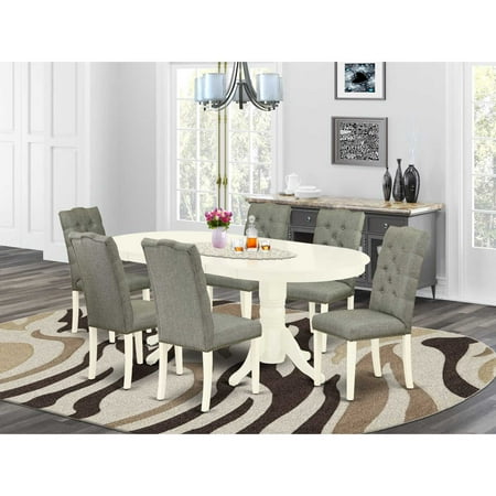 Dining Room Set Linen White VAEL7-LWH-07 EAST WEST FURNITURE 7-PIECE DINETTE SET 6 LOVELY PARSONS DINING CHAIRS AND OVAL WOOD TABLE This dining table set includes 6 amazing parson dining chairs and a great double pedestal legs oval table. The modern dining room set provides a Linen White hardwood dining table and frame and an excellent Smoke parson chairs seat and high back that bring elegance to your dining room and enhance the elegance of your amazing dining area. The prime quality of our attractive chairs helps our wonderful customers to get relaxation and feel free when getting their meal. This butterfly leaf dinette table manufactured from good quality rubber wood which can bear the weight of 300 Lbs. Our parson dining chairs have a wooden structure with a luxury seat of high-quality foam which is covered with Linen Fabric that gives you relaxation with friends or family. This listing has a premium color of Linen White finish for living room table and Smoke finish of parson chairs. Our attractive premium colors boost the beauty of your living area and provide a magnificent look to your living area or dining area. East West Furniture always constructed from modern furniture along with easy assembling parts. We try to keep our furniture parts modern as well as simple. Our high-class kitchen table set is perfect for your beautiful living area as well as the kitchen. You can use it for casual home parties. Keep enjoying East West modern furniture! Features: Small Dining Table Dimension: Length 59/76; Width 40; Height 30. Wood Color: Linen White Fabric: Linen Fabric Parson Dining Room Chairs Dimension: Length 19; Width 25; Height 41. Fabric Color: Smoke Package Include: 6 Attractive Kitchen Parson Chairs and A Lovely small table. This kitchen table set includes the 6 stylish parson dining chairs. Parson Dining Chairs has a style fit for royalty. Our Dining Chairs are upholstered in your choice of color properly accented with button tufting. This standard parson dining chairs The upholstered dining chairs seat and back are padded and button tufted. The long-lasting wooden legs are finished in Linen White color to match the design. These high-back parson chairs are slightly and elegantly curved expertly finished with velv Our kitchen table set is crafted from wood and fabric. This wood offers wonderful stability and fabric provides cozy sitting. These parson chairs and dining room table are created from the hands of experienced carpenter that’s why this kitchen table We dinette set is comfortable and relaxing because the back and seat of our parson dining room chairs are fabricated of high-quality Linen Fabric which delivers complete comfort and excellent sitting experience. Our wood dining table is including do Specifications of Stunning small dining table: Length 59/76; Width 40; Height 30. The measurements of wonderful upholstered dining chairs are: Length 19; Width 25; Height 41. All these stylish parson chairs and a kitchen dining table are simple to assemble. The timeless design of these unique parson dining chairs fits properly with any decor and a soft cushion padded in smooth Linen Fabric will keep users comfortable. Our upholstered dining chairs hardwood frame and Linen Fabric seat are quite simple to clean. You can clean dust simply and frequently to save time by using a duster or vacuum cleaner. A timeless easy stylish design can match perfectly with any decor – Item1 Dims: L 59/76 x W 40 x H 30 – Item1 Type: Dining Table – Item2 Type: Table Pedestal – Item3 Dims: L 19 x W 25 x H 41 – Item3 Type: Parson Chairs