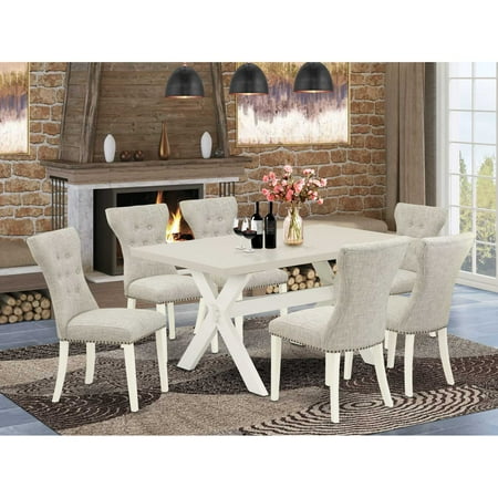 EaST WEST FURNITURE 7-PC RECTaNGULaR DINING TaBLE SET 6 LOVELY PaRSONS CHaIRS and RECTaNGULaR DINETTE TaBLEThis dining room table set includes 6 remarkable Padded Parson Chairs and an excellent X-leg small dining table. The modern dining table set gives a Black solid wood dining table and body and a great Mineral Blue Kitchen Parson Chairs seat and high back that bring elegance to your living area and enhance the charm of your amazing living area. The prime quality of our gorgeous chairs helps our beautiful customers to get relaxation and feel free when getting their meal. This butterfly leaf table manufactured from high-quality rubber wood which can bear the weight of 300 Lbs. Our parson dining chairs have a wooden structure with a luxury seat of premium quality foam which is covered with Linen Fabric that delivers you relaxation with friends or family. This listing has a premium color of Black finish for wood table and Mineral Blue finish of Padded Parson Chairs. Our wonderful premium colors enhance the beauty of your dining room and provide a high-class look to your living area or dining area. East West Furniture usually built from modern furniture along with easy assembling parts. We try to keep our furniture parts innovative as well as simple. Our high-class dinette set is ideal for your beautiful dining area as well as the kitchen. You can use it for casual home parties. Keep enjoying East West modern furniture!Features:Fabric Material: Linen FabricFabric Color: Brown SmokeMeasurement of gorgeous wood dining table: L 60 x W 36 x H 30. The measurements of incredible kitchen parson chairs are: L 19 x W 25 x H 41Package Include: 6 amazing parson dining chairs and an attractive small rectangular table.