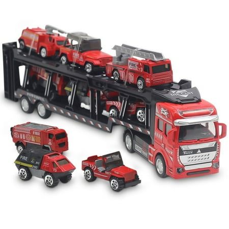 Funtogether Toys 32cm Pull-Back Car Carrier Truck with Separable Fire Truck – Interactive Construction Vehicle Toy for Boys This vividly designed car carrier truck offers a realistic play experience that sparks children’s imagination and encourages creative storytelling. Featuring a pull-back function the truck moves forward smoothly when released helping develop fine motor skills and hand-eye coordination. The carrier bed holds multiple small cars allowing kids to transport and showcase their vehicle collections while enhancing organizational skills. Its detailed fire truck design provides educational fun teaching children about different types of emergency vehicles. Perfect for playtime and collectors alike this durable and safe toy offers endless entertainment for boys and vehicle enthusiasts.