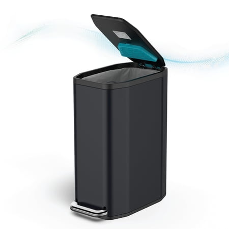 From Home Zone Living this 13-gallon slim stainless steel trash can helps keep your kitchen organized and odor-free. The space-saving octagon shape fits perfectly in narrow spots such as between counters or appliances. The built-in CleanAura compartment houses an odor-absorbing filter that helps neutralize unwanted smells while the soft close lid ensures quiet smooth operation. The step pedal allows for hands-free convenience and the removable liner includes a built-in bag tuck band to hold liners securely in place. With its sleek black stainless steel finish that resists fingerprints and smudges this trash can combines modern style with everyday freshness and function.