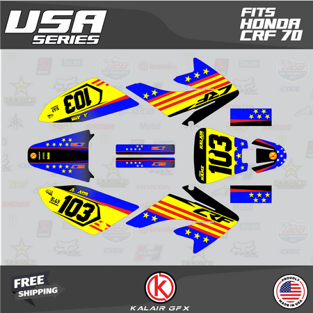 *** WE OFFER FREE CUSTOM RIDER NAME & NUMBER *** Your custom name & number must be provided during checkout under “message to seller” or through Walmart messaging immediately after placing the order. Otherwise graphics as shown in the listing are shipped. Fits Honda CRF70 (2004-2023) OEM or OEM-replica plastics. The complete graphics kit includes all the pieces shown in the listing. Plastics are NOT included. Thicknesses for durability against scratches and falls: 9 Mil – for light use 16 Mil – high durability 21 Mil – max durability Market-leading designs printed on triple-layered vinyl with a glossy UV protective layer and ultra-aggressive adhesive specifically engineered for motocross and ATVs Precision cut ready to install All materials including vinyl and laminate are made in the USA