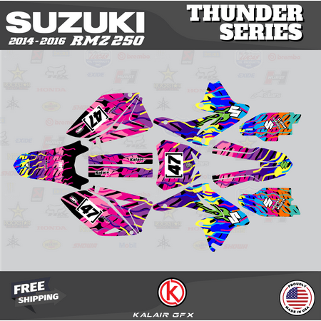 *** WE OFFER FREE CUSTOM RIDER NAME & NUMBER *** Your custom name & number must be provided during checkout under “message to seller” or through Walmart messaging immediately after placing the order. Otherwise graphics as shown in the listing are shipped. Fits Suzuki RMZ250 (2014-2016) OEM or OEM-replica plastics. The complete graphics kit includes all the pieces shown in the listing. Plastics are NOT included. Thicknesses for durability against scratches and falls: 9 Mil – for light use 16 Mil – high durability 21 Mil – max durability Market-leading designs printed on triple-layered vinyl with a glossy UV protective layer and ultra-aggressive adhesive specifically engineered for motocross and ATVs Precision cut ready to install All materials including vinyl and laminate are made in the USA