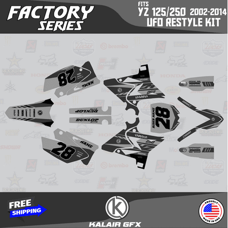 *** WE OFFER FREE CUSTOM RIDER NAME & NUMBER *** Your custom name & number must be provided during checkout under “message to seller” or through Walmart messaging immediately after placing the order. Otherwise graphics as shown in the listing are shipped. Fits Yamaha YZ250 UFO RESTYLED (2002-2014) OEM or OEM-replica plastics. The complete graphics kit includes all the pieces shown in the listing. Plastics are NOT included. Thicknesses for durability against scratches and falls: 9 Mil – for light use 16 Mil – high durability 21 Mil – max durability Market-leading designs printed on triple-layered vinyl with a glossy UV protective layer and ultra-aggressive adhesive specifically engineered for motocross and ATVs Precision cut ready to install All materials including vinyl and laminate are made in the USA