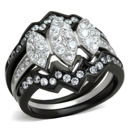 An outfit isn t complete without wearing a piece of jewelry as it works like icing on the cake . Be it a casual outing or a professional gathering wearing a piece of accessories will enhance the look. This ring with clear cubic zirconia will surely be the best choice. The black ion plating makes it a perfect ornament. Product Features: 3-piece stainless steel wedding ring set. AAA grade cubic zirconia stones. Center stone color: clear. Side stone color: clear. Center stone shape: round. Side stone shape: round. Center stone setting: surface prong. Side stone setting: pinpoint. Band style: traditional. Two tone black ion plated stainless steel band. Made from highly corrosive resistant TK316 stainless steel. Ring size: women s 9. Center stone size: 2 (mm). Weight (approx): 6.60 (g). . Material(s): stainless steel/cubic zirconia