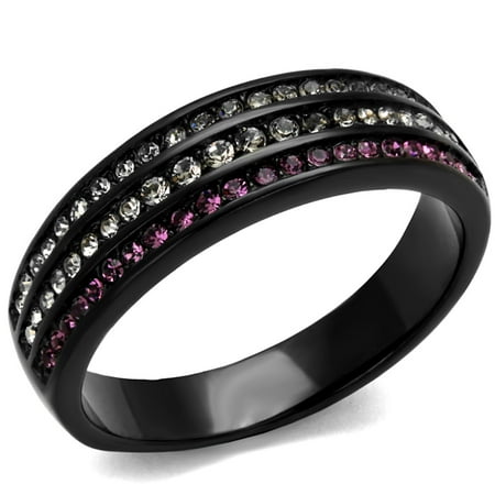 Promising an elegant tale of love this band ring will be a remarkable addition to your jewelry collection. Made of stainless steel it has a black ion-plated finish. Embellished with sparkling crystals in an amethyst shade it will perfectly complement your stylish outfits. The beautiful accessory is suitable for romantic dates parties events etc. Product Features: Stainless steel ring for women. Top grade crystal stones. Stone color(s): amethyst and clear. Stone shape(s): round. Stone setting(s): pave. Band style: tapered. Black ion plated finish. Made from highly corrosive resistant TK316 stainless steel. Ring size: women s 6. Weight (approx): 3.41 (g). Material(s): stainless steel/crystal