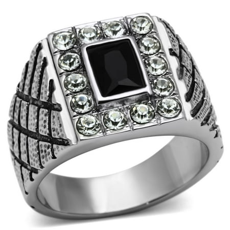 Essentially every men s closet should hold at least one endearing and fashionable accessory such as this high-polished stainless steel ring. This chic ring encompassing a synthetic glass center stone in jet color helps you create a bold dauntless appeal. It is a durable and reliable fine jewelry that is worthy of your tie and money!. Product Features: Stainless steel men ring with epoxy. Black jet synthetic glass stone. Stone color: clear. Center stone shape: rectangle. Side stone shape: round. Stone setting: prong. Stainless steel band with high polished finish – no plating. Made from highly corrosive resistant TK316 stainless steel. Ring size: men s 8. Center stone size: 7 5 (mm). Weight (approx): 12.30 (g). Material(s): stainless steel/synthetic glass stone. Pack of 2