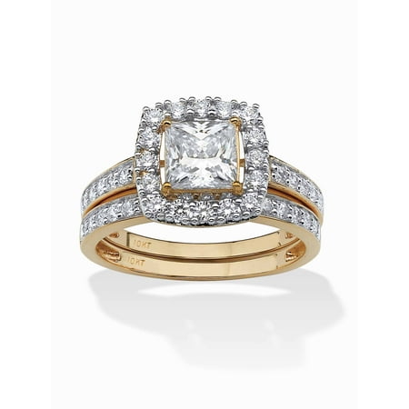 PalmBeach Jewelry exclusive. So sophisticated so sparkly so affordable. 1.93 carats T.W. of fiery cubic zirconia make this halo wedding ring set so very special. The stunning princess-cut center shimmers like no other. Solid 10k yellow or white gold. 54732RNG