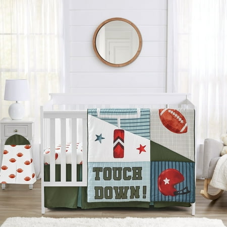 The 4pc Football baby bedding collection by Sweet Jojo Designs will create the perfect sports themed nursery for your little MVP. You’ll score a touchdown with this all-star athletic inspired boy crib bedding set which uses a sensational collection of exclusive brushed microfiber fabrics. It boasts a hand painted football helmet and field goal post combined with a coordinating allover football print. The vintage yet stylish color palette of dark hunter green grey red brown and different shades of blue will make your nursery ready for the Superbowl. This game winning Sweet Jojo Designs set will fit all standard cribs and toddler beds and is machine washable for easy care and repeated use. Please note: any Sweet Jojo Designs item with fill; including but not limited to comforters pillows and play mats; is labeled and tagged correctly and fully compliant with applicable local and state laws. Law labels for filled products by Sweet Jojo Designs are easily accessible to any consumer wishing to examine them prior to purchase in the footer of our website under “Law Labels”. Please contact Sweet Jojo Designs customer service with any questions or concerns. Sweet Jojo Designs American Football MVP Boy Baby Crib Bedding Set Infant Nursery Room Blanket Fitted Sheet Skirt Diaper Stacker 4pc Green Blue Red Vintage Helmet Field Goal Sports Themed Grey Stars