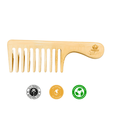 Introducing our All-Natural Bamboo Wide Tooth Comb a sustainable and effective hair care tool designed to promote healthy hair and scalp. Crafted from high-quality bamboo this wide tooth comb offers a range of benefits for your hair and scalp making it a must-have addition to your hair care routine. Hair and Scalp Benefits: 1. Gentle Detangling: The wide teeth of our bamboo comb are designed to gently detangle your hair reducing breakage and minimizing damage. Whether you have thick curly or textured hair this comb glides through knots and tangles with ease preventing unnecessary hair loss. 2. Scalp Stimulation: The act of combing your hair with our bamboo wide tooth comb provides a gentle massage to your scalp promoting blood circulation and stimulating the hair follicles. This can enhance the overall health of your scalp creating an optimal environment for hair growth. 3. Even Product Distribution: The wide gaps between the teeth of our bamboo comb allow for even distribution of hair products such as conditioners serums or oils. This ensures that your hair receives the nourishment it needs from root to tip resulting in improved hydration and enhanced hair vitality. 4. Natural Material: Bamboo is a natural material that is gentle on both your hair and the environment. Unlike plastic combs our bamboo comb does not produce static electricity which can cause frizz and flyaways. It also does not contain any harmful chemicals making it a safe and eco-friendly choice for your hair care routine. Additional Features: 1. Sustainable and Durable: Our bamboo wide tooth comb is crafted from sustainable bamboo a renewable resource that is known for its durability and strength. This ensures that your comb will last for a long time reducing the need for frequent replacements. 2. Lightweight and Portable: The compact size and lightweight nature of our bamboo comb make it ideal for travel or on-the-go use. It easily fits into your purse bag or pocket allowing you to maintain your hair s health and style wherever you are. Using our All-Natural Bamboo Wide Tooth Comb is simple: 1. Start with dry or damp hair. 2. Hold the comb by the handle and begin combing from the ends of your hair working your way up to the roots. The wide teeth will gently detangle without causing breakage. 3. Enjoy the scalp stimulation as you comb through your hair promoting blood circulation and supporting healthy hair growth. 4. Repeat as needed to maintain a well-groomed and healthy-looking hair. Embrace the benefits of our All-Natural Bamboo Wide Tooth Comb and experience the gentle detangling scalp stimulation and even product distribution it offers. Made from sustainable bamboo this comb is not only good for your hair and scalp but also for the environment. Elevate your hair care routine with this eco-friendly and effective comb and enjoy the beauty of healthier more manageable hair.