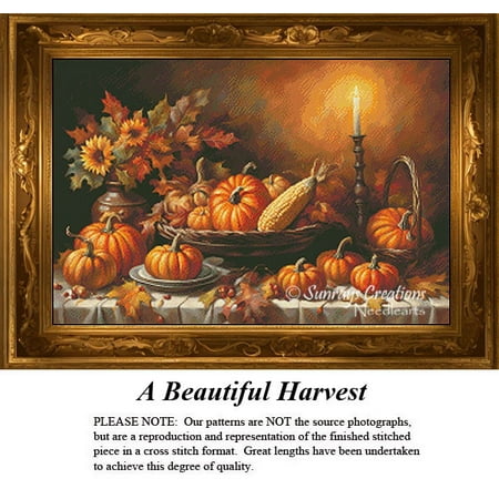 Bring the warmth and bounty of the season into your home with A Beautiful Harvest Thanksgiving Counted Cross Stitch Pattern. This exquisite full-coverage counted cross stitch design captures a stunning tableau of a long table covered in a white tablecloth and generously loaded with bountiful harvest treasures. This detailed chart is the perfect autumn cross stitch pattern and Thanksgiving needlework project for the seasoned stitcher. Acorns and bright-colored fall leaves serve as the perfect decorative accent enhancing the seasonal charm. The centerpiece is a large wicker basket overflowing with nature s gifts-pumpkins gourds and corn-while larger pumpkins cluster around it. A striking arrangement of sunflowers and fall leaf branches graces the table alongside a tall white candle in a wooden holder. The inviting ambiance of seasonal bliss is beautifully rendered through the use of 79 solid DMC thread colors-achieving a truly realistic effect with no blended colors. The glow from the candle s flame is captured with colors brightest towards the center and softly fanning out over the table. This fall cross stitch design is a perfect way to create a cherished seasonal home décor piece. A Beautiful Harvest has a large Stitch Count of 306w x 205h and is charted for Antique White Aida Fabric. Approximate finished sizes range from 14 Count (21-3/4w X 14-5/8h in) to 22 Count (13-7/8w X 9-1/4h in) making it a versatile cross stitch chart for various framing options. What you will receive!!! Our patterns arrive with a color visual photo of finished design wash and care instructions handy tips for working the pattern instruction sheet detailing color of fabric sizes a complete color listing including number of skeins to purchase. The pages are safely enclosed in a clear reclosable polybag. The Perfect Gift for the Crafty Loved One This detailed cross stitch pattern makes The Perfect Gift for the stitcher in your life or the needlework expert who appreciates a vibrant full-color autumn scene. Give the gift of a beautiful project to the crafty loved one in your family or circle of friends. It s a thoughtful present for anyone who loves the art of cross-stitching and wants to create a stunning large-format holiday décor piece. This harvest-themed cross stitch is ideal for celebrating the Season of Thanks. Pattern Only You Provide the Floss and Fabric